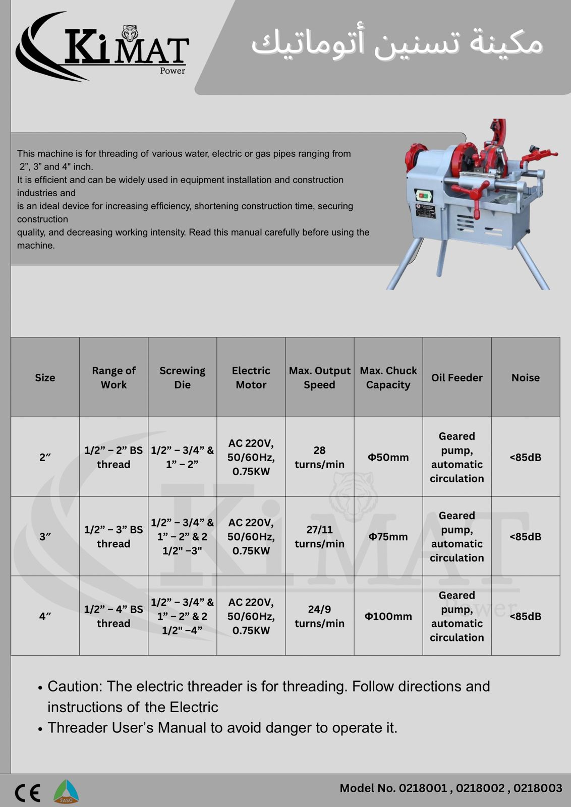 ماكينة تسنين مواسير صناعية عالية الاعتمادية، متوفرة بمقاسات 2″ و3″ و4″، مزودة بمحرك كهربائي بقدرة 0.75 كيلوواط يعمل على 220 فولت، ونظام تشحيم أوتوماتيكي بمضخة تروس لضمان دقة السنّ وطول عمر التشغيل. مصممة للأداء المستمر في الورش والمشاريع الاحترافية مع مستوى ضوضاء منخفض وكفاءة تشغيل عالية